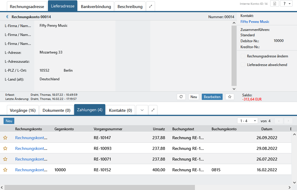 Im unteren Bereich des jeweiligen Rechnungskontos finden Sie viele Registerkarten mit weiteren Informationen zum Rechnungskonto. Auch diese Ansicht mit der Anzahl und Reihenfolge der Registerkarten kann sich von Ihrer persönlichen Ansicht unterscheiden.