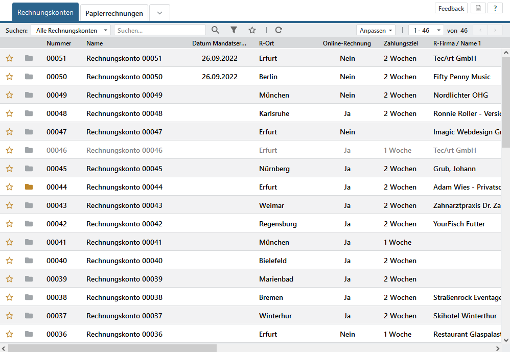 | Häufig verwendete Datensätze können Sie als Favorit markieren. Dabei färbt sich am Anfang der Zeile der Stern gelb ein. Sofern verschiedene Datensätze markiert wurden ist auch die Filterung nach den Favoriten mit dem Button in der Übersicht möglich. Weiterhin werden Dokumente der markierten Datensätze über TecArt-Drive synchronisiert. |