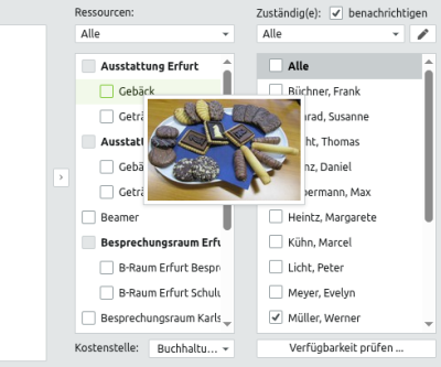 Über das obere Drop-Down-Feld können Sie die Art der Ressource vorfiltern. Markieren Sie durch Setzen der Haken, welche Ressourcen Sie zu dem Termin hinzubuchen möchten. Gegebenenfalls wählen Sie alternativ eine hinterlegte Kostenstelle aus. Nach dem Speichern kann es vorkommen, dass Sie bei Mengen- und Verbrauchsressourcen noch weitere Angaben tätigen müssen.