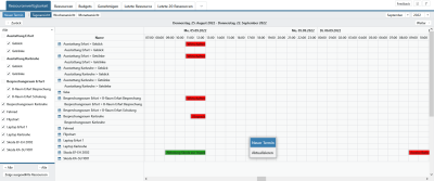 Eine weitere Möglichkeit der Buchung von Ressourcen besteht direkt über den Terminkalender der Ressourcenverfügbarkeit. Gehen Sie mit der rechten Maustaste auf die angezeigte Ressource und klicken Sie auf . Bei dieser Art der Buchung ist die gewählte Ressource bereits ausgewählt und Sie können gern weitere Ressourcen zusätzlich auswählen. Handelt es sich um Mengen- oder Verbrauchsressourcen, werden Sie nach dem Speichern gebeten, entsprechende Mengen anzugeben.