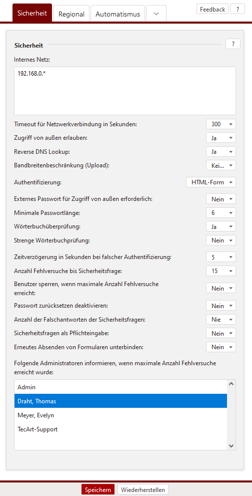 | Folgende Administratoren informieren, wenn maximale Anzahl Fehlversuche erreicht wurde | Dies regelt die Informationskette, welcher zuständige Administrator über die fehlerhaften Logins informiert werden soll. Mehrere zu informierende Administratoren wählen Sie bitte mit gedrückter Strg-Taste aus. Wird der Benutzer nicht gesperrt, kann dieser sich weiterhin versuchen einzuloggen. Die Benachrichtigung an den Administrator erfolgt dennoch. |