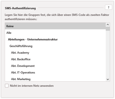 Sie können über die Gruppenauswahl festlegen, für welche Gruppen der Zugang über die Authentifizierung erfolgen muss. Mehrere Gruppen können Sie mit gedrückter Strg-Taste auswählen. Weitere Voraussetzung ist eine im Feld Mobiltelefon in der Benutzerverwaltung hinterlegte Mobilfunknummer oder SMS vorlesende Festnetznummer. Nach dem klassischen Login mittels Benutzernamen und Passwort oder einem automatischen Login, wird ein SMS-Code generiert und an die im Feld Mobiltelefon hinterlegte Nummer gesendet. Der Benutzer hat nun innerhalb 5 Minuten Zeit diesen Code in das vorgesehene Feld einzutragen.