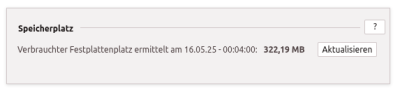 Im Abschnitt Speicherplatz wird der aktuell vom System genutzte Speicherplatz auf dem Server angezeigt. In der Regel wird dieser einmal täglich ermittelt. Über wird die Anzeige sofort neu berechnet. Gezählt wird dabei der gesamte Speicher Ihres TecArt CRM mit den Bestandteilen der Datenbank, den E-Mails und Dokumenten sowie Daten Ihres globalen Papierkorbs.