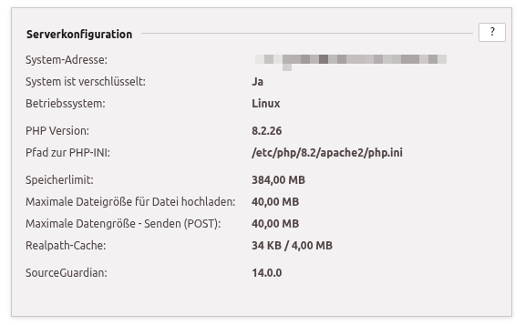 | System ist verschlüsselt | gibt an, ob der Quellcode Ihres Systems durch SourceGuardian verschlüsselt ist. Dies ist bei Kunden-Systemen immer der Fall. |