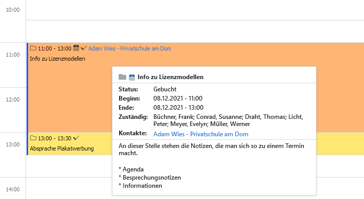 Sofern in Ihren persönlichen Informationen die Option Zeige erweiterte Informationen in Terminübersicht eingeschaltet wurde, erhalten Sie jeweils eine Terminkurzinformation, wenn Sie etwas länger mit dem Mauszeiger auf einem Termin verweilen.