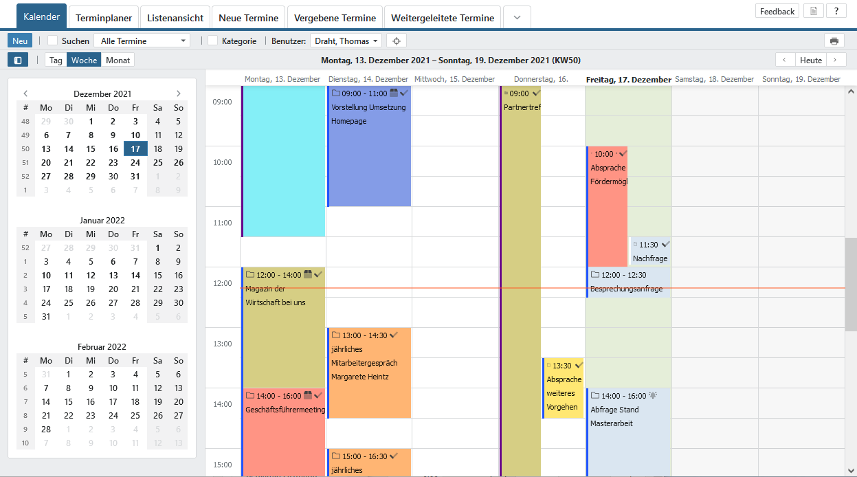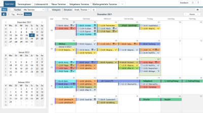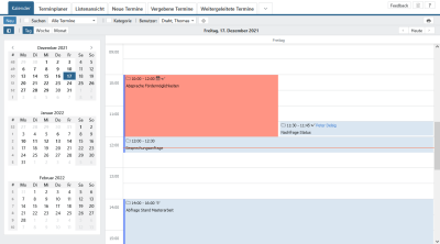 Darüber hinaus haben Sie die Möglichkeit, zwischen den Ansichten nach , und zu wechseln. Ausgehend vom aktuell gewählten Datum werden Ihnen mehrere Wochen in die Vergangenheit und Zukunft dargestellt. Am übersichtlichsten ist dabei die Tagesansicht, da Sie hier Details zu den Terminen sehen. Auf Wunsch können Sie den angezeigten Bereich begrenzen über .