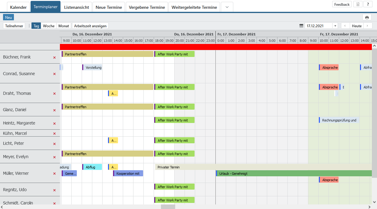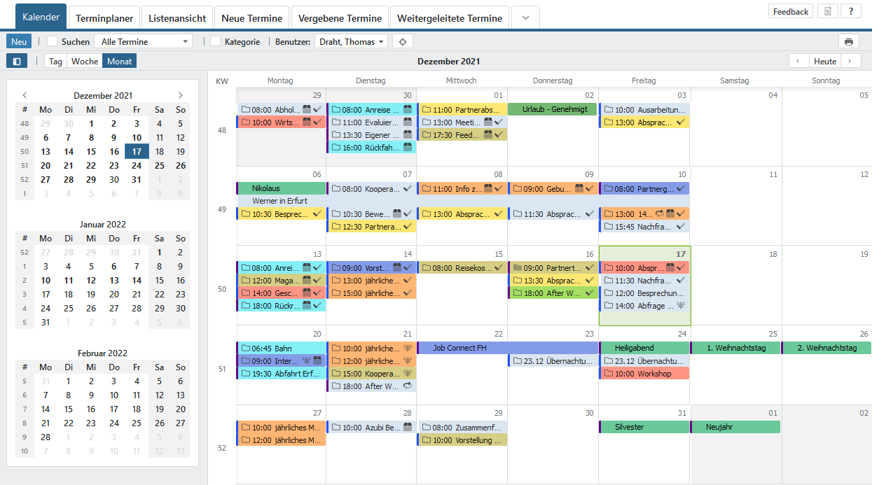 Alle Feiertage, die für Sie gelten, werden in Ihrem Terminkalender als Ganztagestermine mit dem Merkmal gebucht angezeigt. Lassen Sie sich auch regionale Feiertage anzeigen, die in Ihrem Bundesland nicht gelten, werden diese mit dem Merkmal frei visualisiert. Auch beantragte und genehmigte Urlaubstage können aus dem Modul Urlaubsplanung automatisch in den Kalender übernommen werden. Andere Mitarbeiter haben demzufolge stets einen Zugriff auf Ihre Termine, um die Koordination von anderen Terminen besser durchführen zu können.