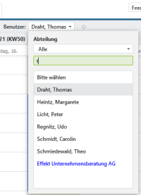 Welche Benutzer angezeigt werden sollen, welche vordefinierten Abteilungen oder selbst zusammengestellte Gruppen, legen sie über den Button fest. Wählen Sie die gewünschten Benutzer aus und klicken Sie danach auf . Direkt nach der Bestätigung werden die ausgewählten Benutzer im Terminplaner angezeigt. Um Benutzer in der Übersicht auszublenden, genügt in der entsprechenden Zeile ein Klick auf das rote .