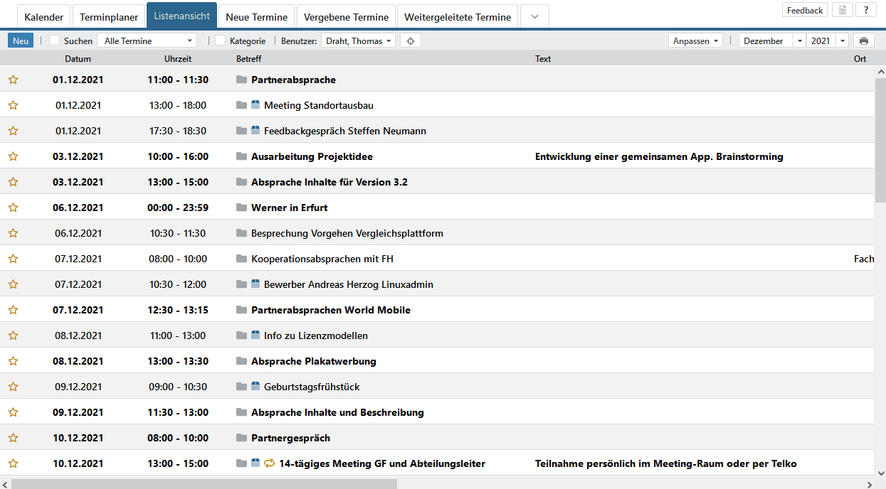 - Listenansichten Listenansichten sind tabellarische Auflistungen von Kalendereinträgen für einen gefilterten Zeitraum. Hier gibt es weitere Möglichkeiten an gefilterten Registerkarten