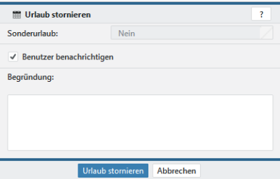 Um einen Urlaub abzulehnen oder zu stornieren, markieren Sie die gewünschte Zeile über das Kontrollkästchen und wählen Sie über das Kontextmenü den Punkt oder . Es öffnet sich ein Dialogfenster, in das Sie zwingend eine Begründung für die Ablehnung oder Stornierung eintragen müssen. Schließen Sie Arbeiten mit bzw. ab.