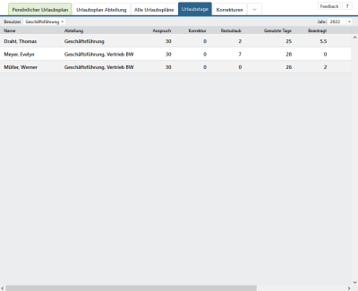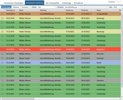 Neben der Sicht des Mitarbeiters sehen Genehmigende der ersten Instanz (z.B. Abteilungsleiter) darüber hinaus noch die Registerkarten Urlaubsplan Abteilung und Urlaubstage. Über das Register Urlaubsplan Abteilung können Sie beantragte Urlaube Ihrer Mitarbeiter genehmigen, stornieren oder ablehnen. Wunschurlaub können Sie nur stornieren, da sich dieser nicht im Genehmigungskreislauf befindet. Eine Übersicht des Urlaubsanspruchs, Resturlaubs, genutzter und beantragter Tage sowie der Krankheitstage der Abteilungen erhalten Sie im Register Urlaubstage. Darüber hinaus können Sie über einen Rechtsklick die Übersicht als CSV-Datei exportieren.