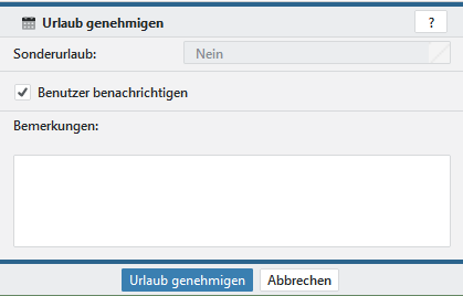 Um einen Urlaub zu genehmigen, markieren Sie die gewünschte Zeile über das Kontrollkästchen und wählen Sie über das Kontextmenü den Punkt oder nutzen den Button . Es öffnet sich ein Dialogfenster, in das Sie bei Bedarf eine Bemerkung eintragen können. Schließen Sie die Genehmigung mit ab.