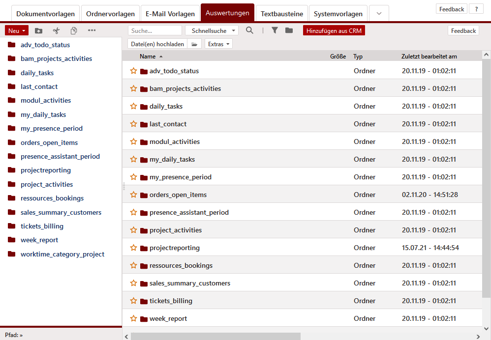 Eigene Auswertungen gestalten. Eine Auswertung liefert Ihnen Ergebnisse von Feldern über verschiedene Module innerhalb des TecArt CRM. Aufgrund der Vielfältigkeit möglicher individueller Felder in Ihrem TecArt CRM ist die Erstellung komplexer Auswertungen ein Entwicklungsprozess. Im Modul Auswertungen werden voll integrierte Auswertungen des TecArt CRM sowie eigene Auswertung auf Basis von Add-ons angezeigt. Im Regelfall gibt es bereits eine Standardvorlage für jede Auswertung.