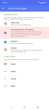 Im weiteren Verlauf finden Sie spezielle Einrichtungshinweise für die unterschiedlichen Betriebssysteme. Bitte beachten Sie, dass die einzelnen Einstellungen aufgrund unterschiedlicher Softwarestände und grundlegenden Möglichkeiten in der Nutzung der unterschiedlichen Endgeräte abweichen können. Bitte verwenden Sie für die Einrichtung den Standard-Mail-Client des jeweiligen Betriebssystems.