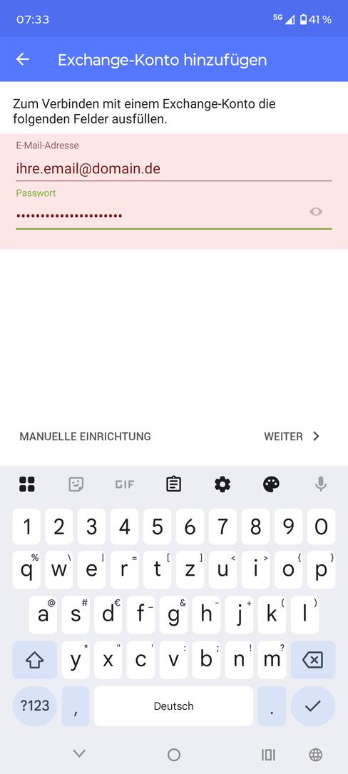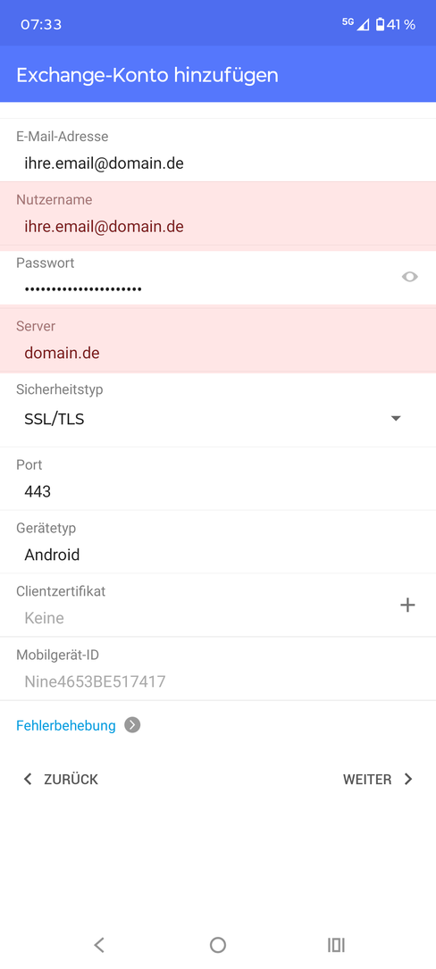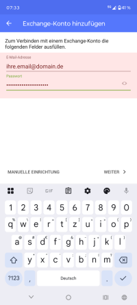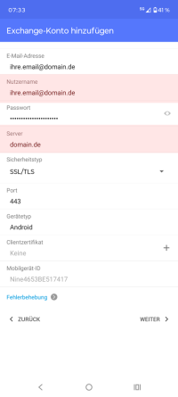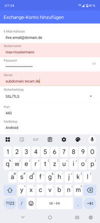 Für die Einbindung mehrerer E-Mail-Konten müssen Sie weitere Einstellungen vornehmen. Richten Sie zunächst ein weiteres ActiveSync-Konto nach den angegebenen Beschreibungen ein. Verwenden Sie in diesem Fall jedoch die E-Mail-Adresse, die Sie synchronisieren möchten. Fahren Sie mit den Angaben bis zum Benutzernamen für die Anmeldung an Ihrem TecArt-System fort.