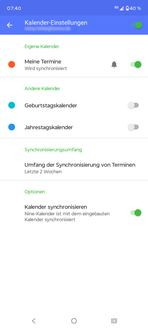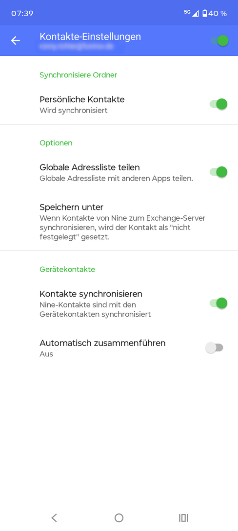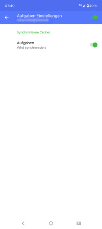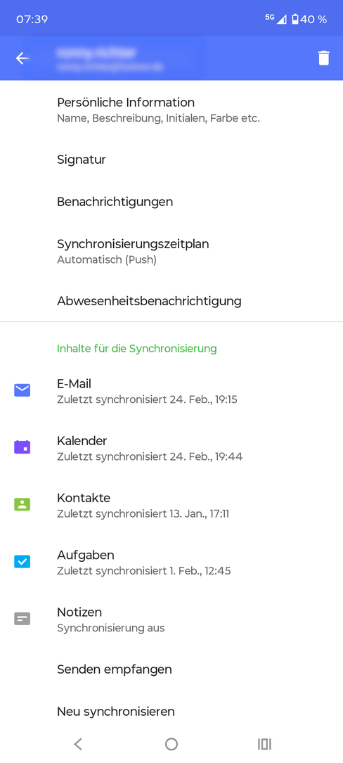 - Prüfen Sie, ob das korrekte Konto für die Kontakt- und Terminanzeige ausgewählt wurde. Sowohl bei den Kontakten, wie auch bei den Terminen, wird das Konto als E-Mail-Adresse oder Kontoname dargestellt. Wählen Sie hierzu Ihre App für Kontakte oder Termine an und navigieren Sie zu den Einstellungen der entsprechenden App.