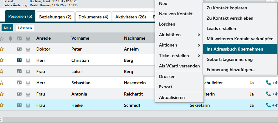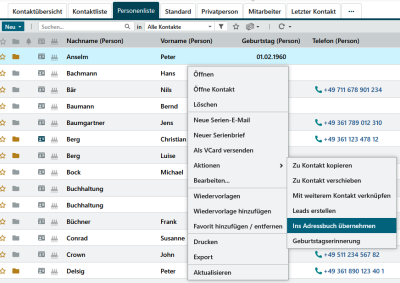Um Kontakte oder Personen zu synchronisieren, öffnen Sie eine der möglichen Listen. Sie können auch einen Kontakt direkt öffnen und auf die Registerkarte Personen wechseln. Über das Kontextmenü haben Sie die Möglichkeit eine Person, einen Kontakt oder alle Personen eines Kontaktes inkl. dem Kontakt zu abonnieren. Diese werden dann in Ihr persönliches Adressbuch übernommen und von dort aus an Ihr mobiles Endgerät synchronisiert.
